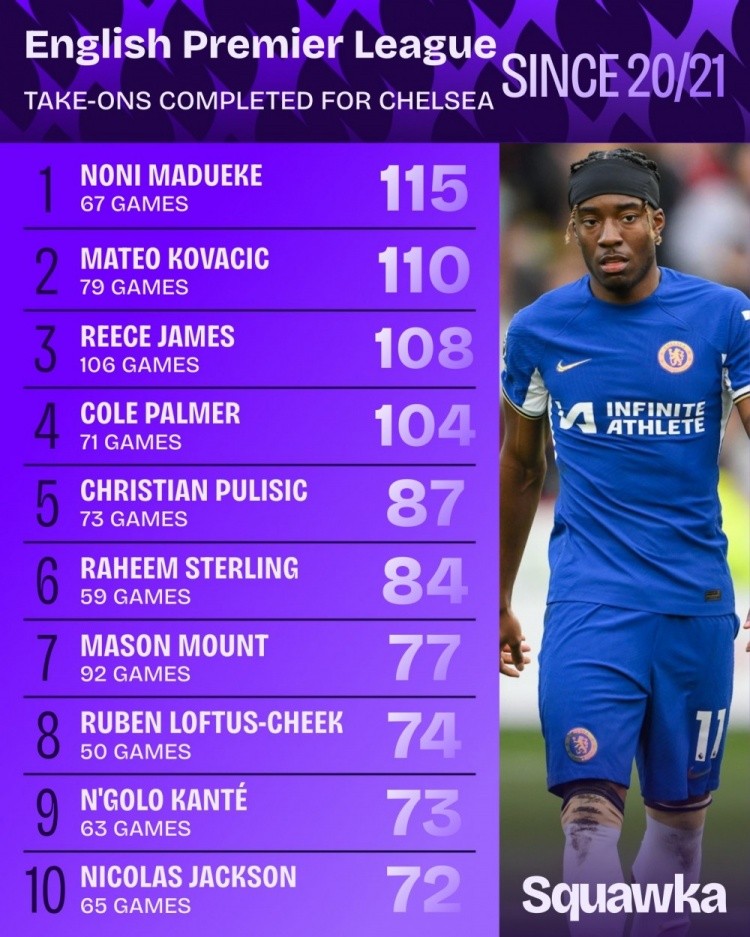 9月7日讯 squakwa统计了20-21赛季以来的切尔西英超成功过人情况,马杜埃凯居首,仅3人仍在阵中。
